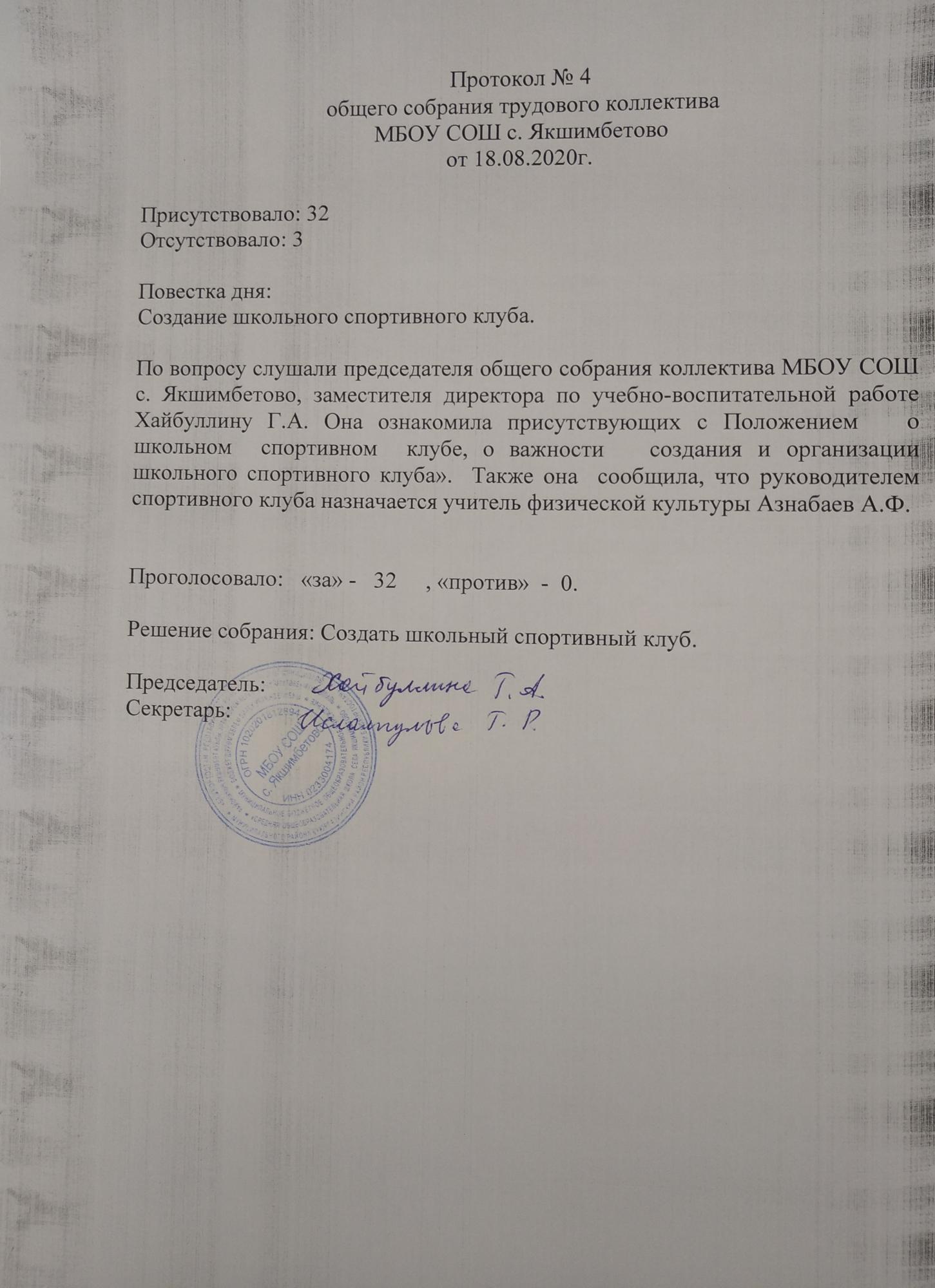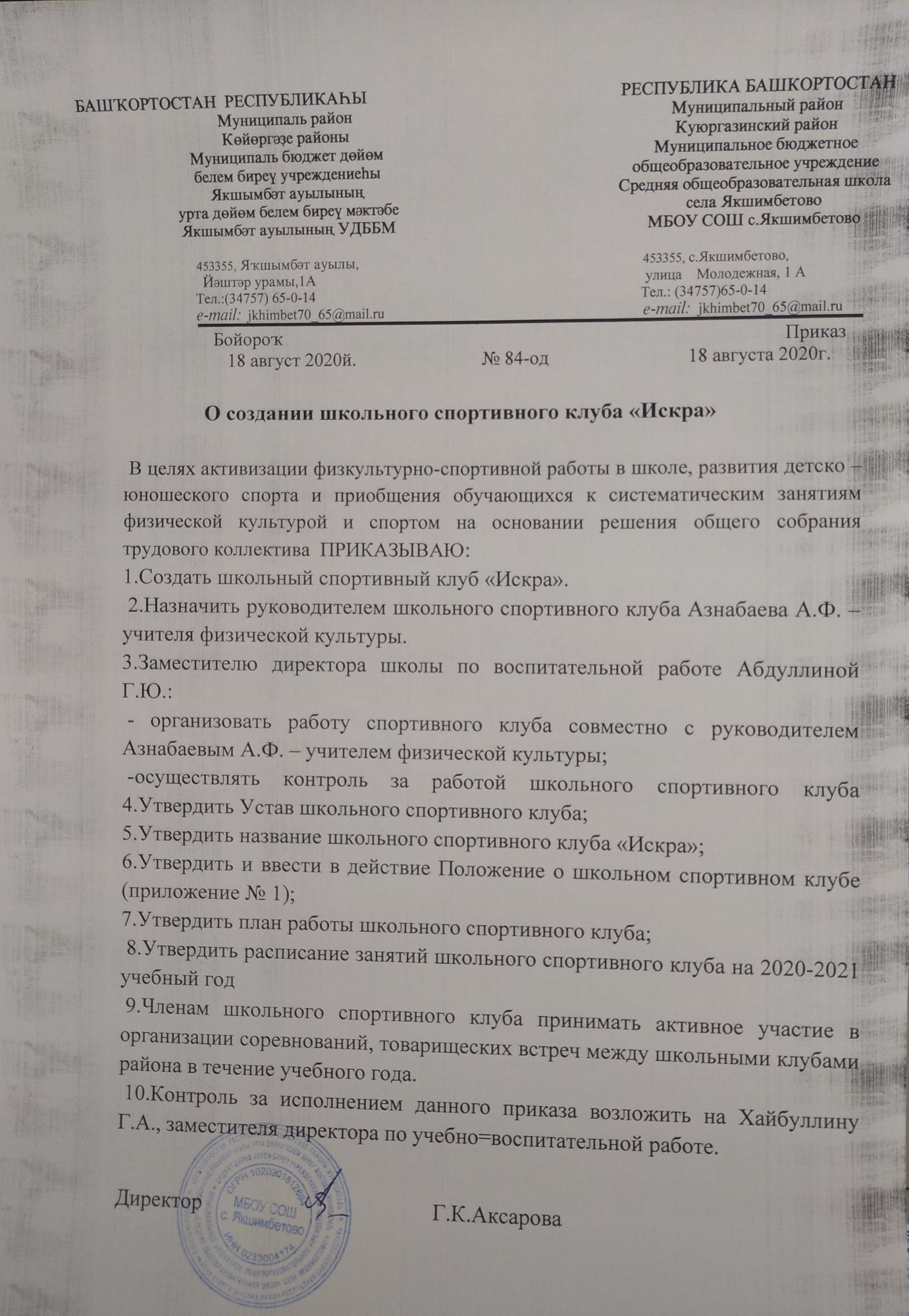 Приказ о создании ШСК (школьного спортивного клуба) на 2020/2021 учебный год