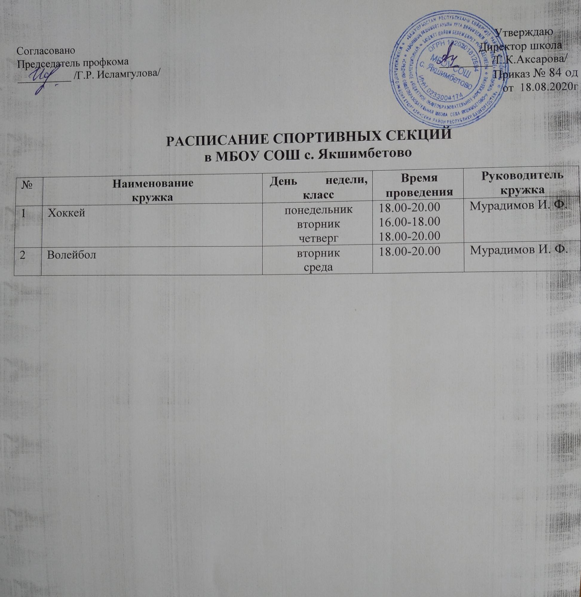 Расписание работы спортивных секций