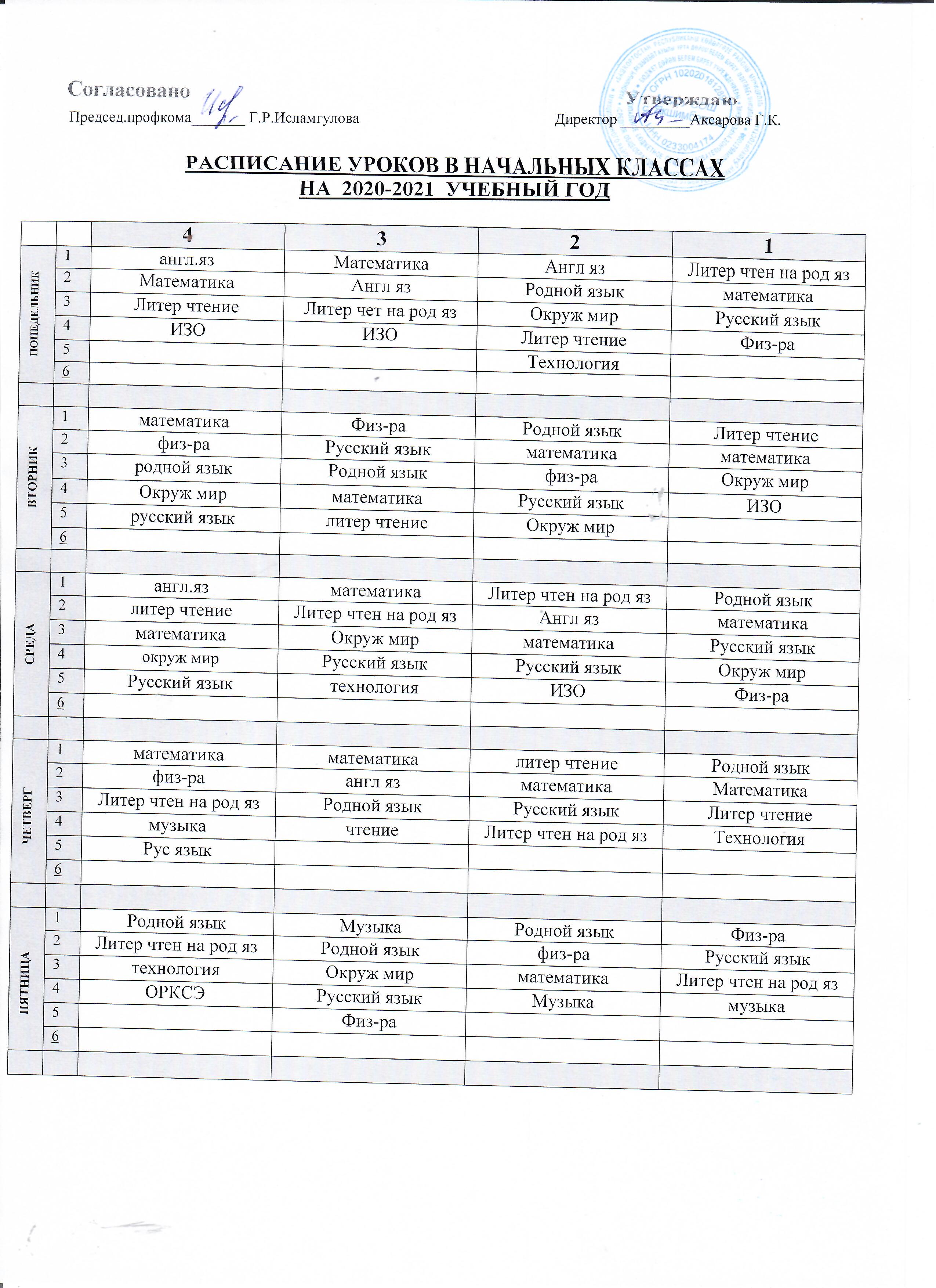Расписание уроков для учащихся 1-4 классов 2020-2021 учебный год