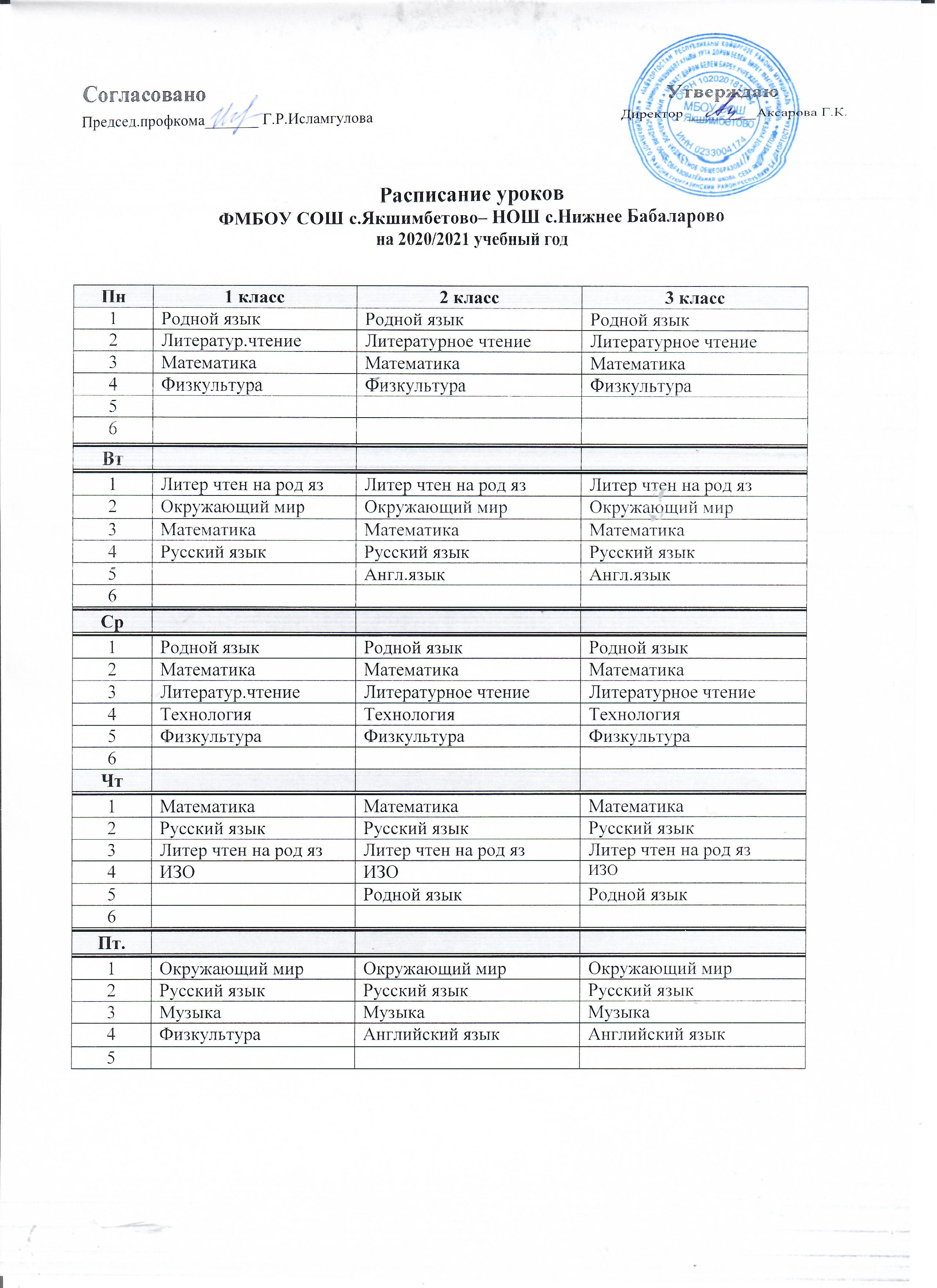 Расписание уроков ФМБОУ СОШ с. Якшимбетово - НОШ с. Нижнее Бабаларово