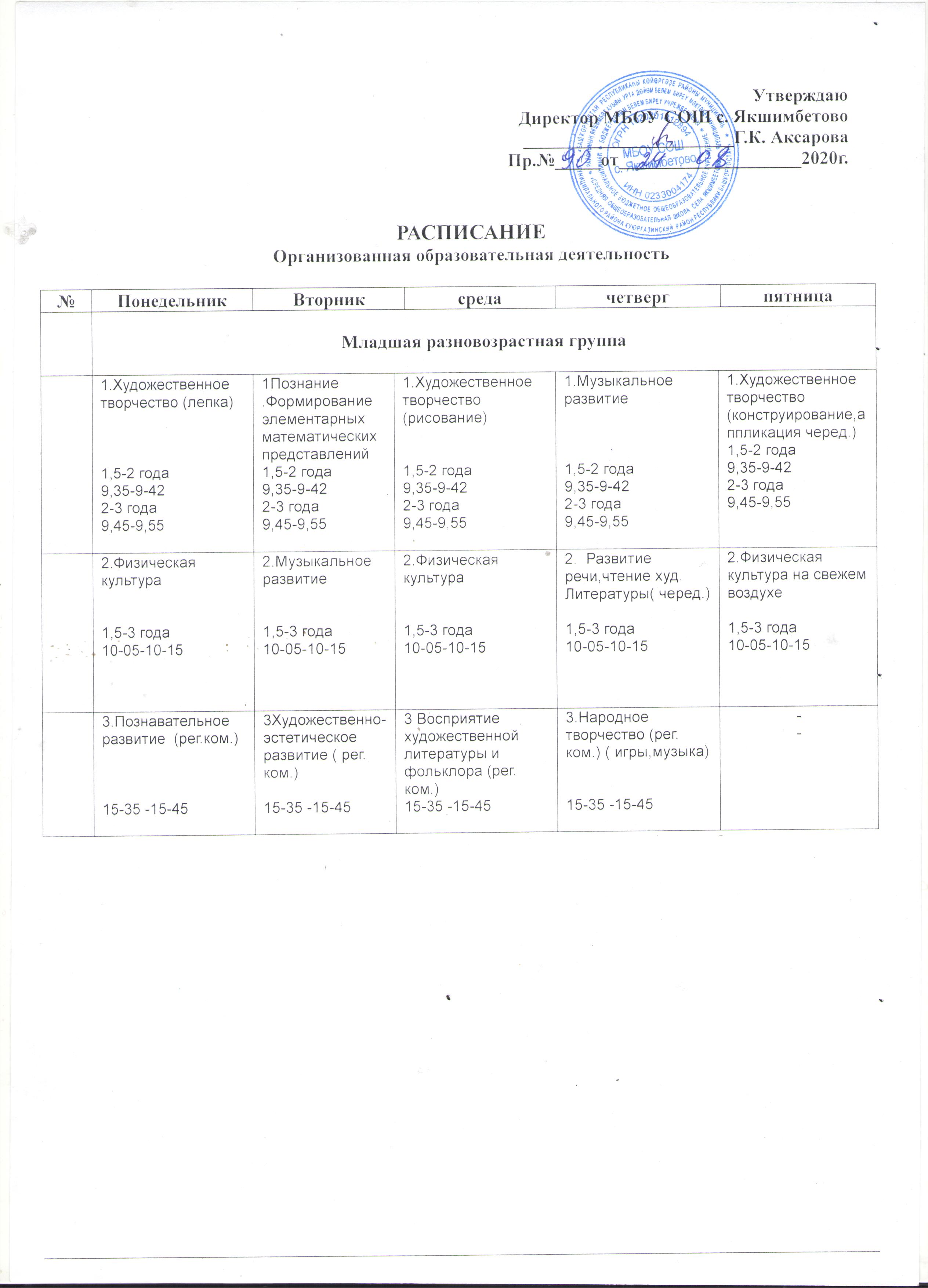 Расписание занятий младшая группа