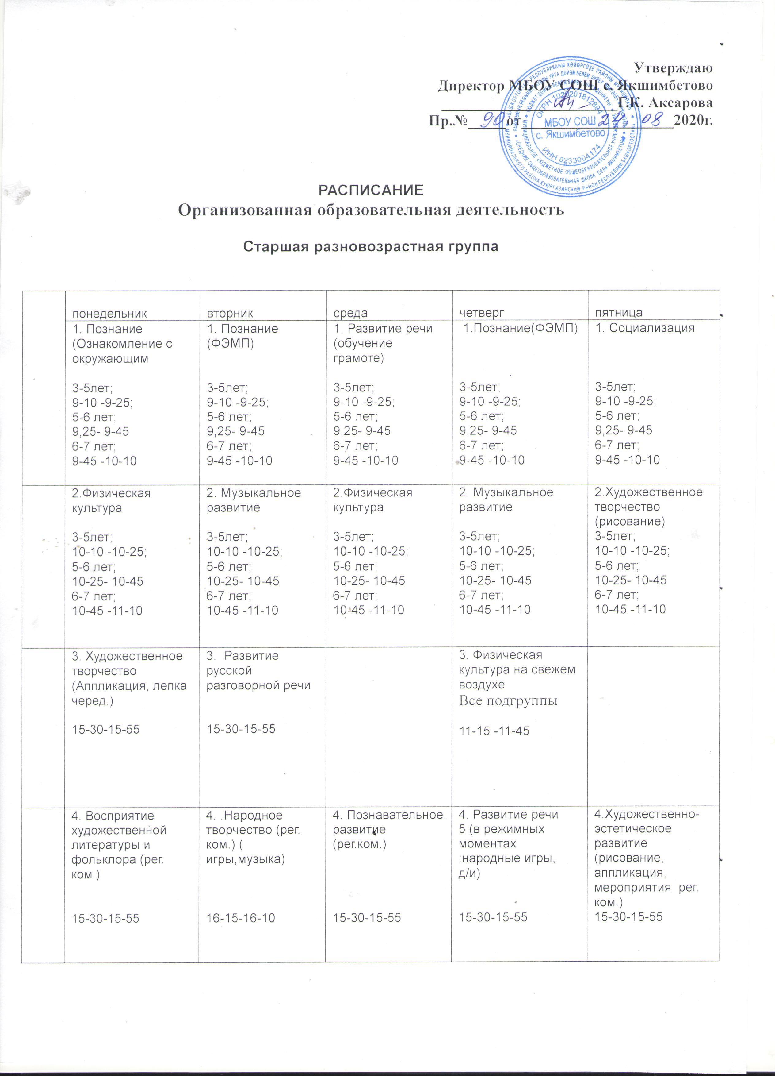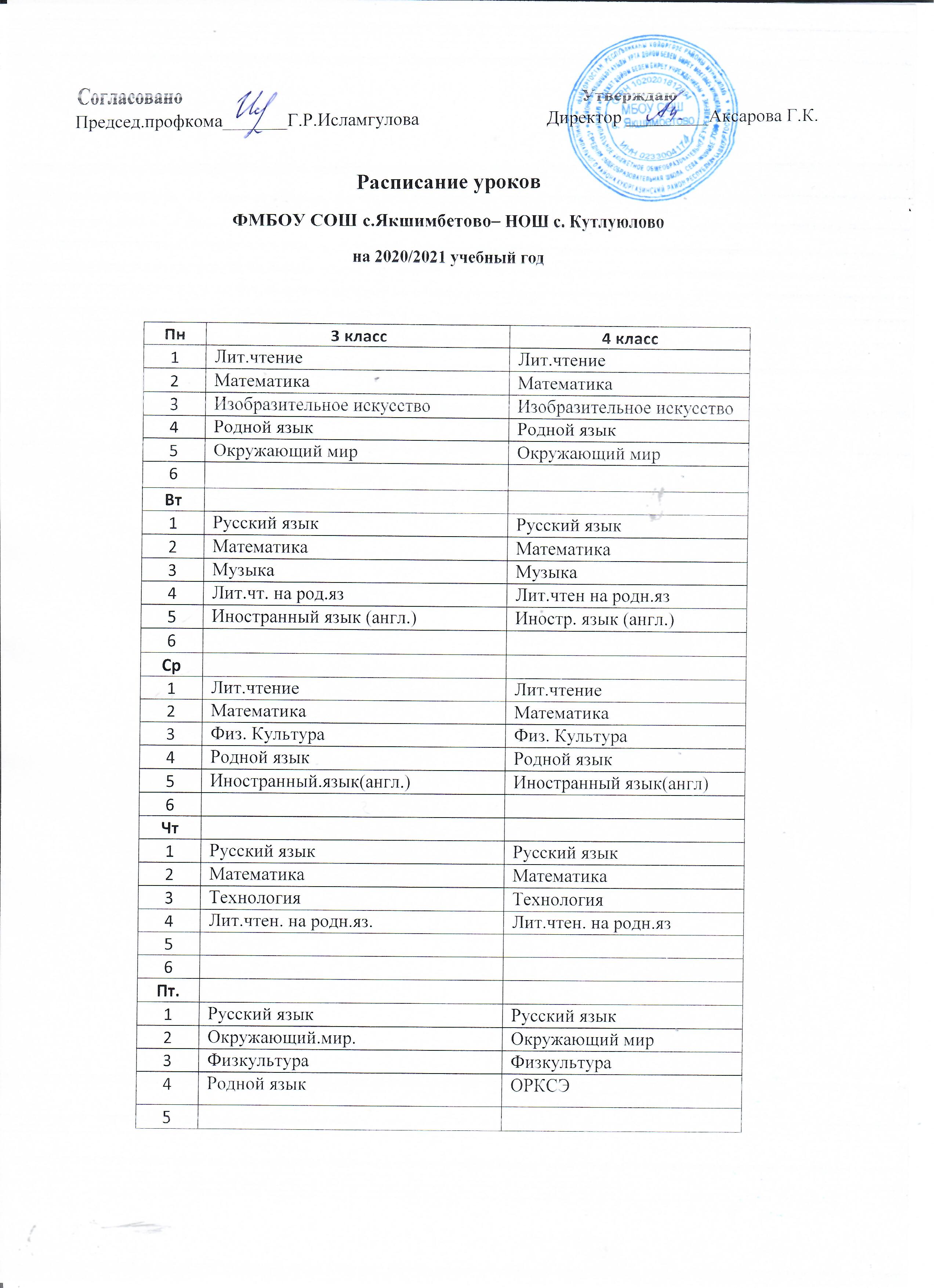 Расписание уроков ФМБОУ СОШ с. Якшимбетово - НОШ с. Кутлуюлово